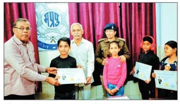 Bhopal: The Paryavaran Sanskriti Trust, in collaboration with the Bajaria Police Station, honored a group of children who displayed remarkable awareness and responsibility in protecting their community. The event was attended by Sushil Kumar Jain, Ramesh Jain, and Vinay Jain (Bawdi Kheda) from the trust, who, along with Station House Officer (SHO) Shilpa Kaurav, presented children Purva Patel, Tanishq Solanki, and Rupal Pal with sweets and the Brave Children Award.